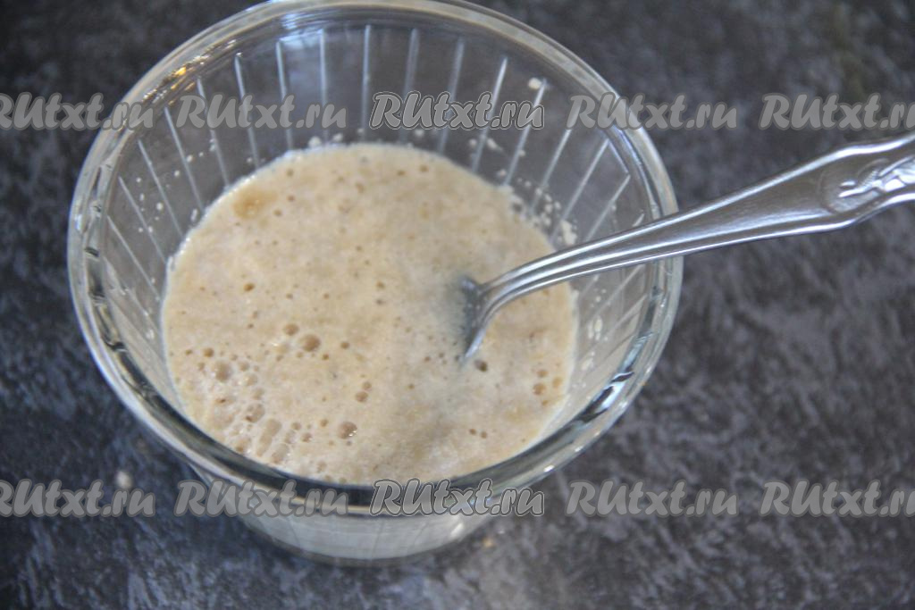 В небольшую ёмкость влить 100 миллилитров тёплой воды (температура воды должна быть не выше 40 градусов), добавить дрожжи, очень хорошо перемешать и оставить минут на 10. В течение этого времени дрожжи начнут работать и на поверхности появится пенная шапочка.