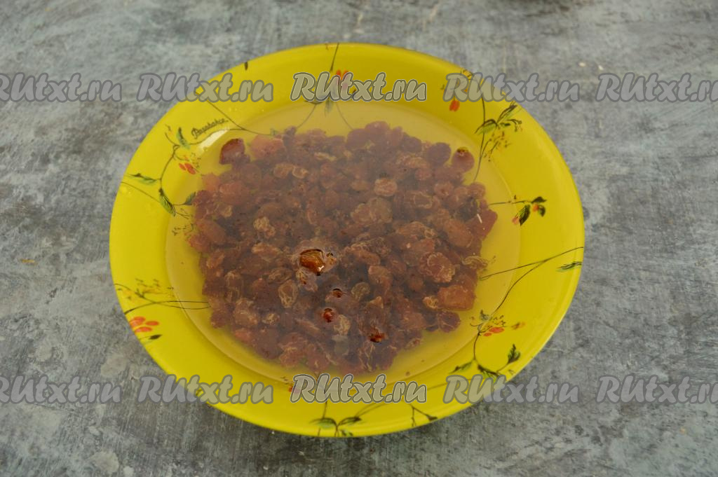 Первым делом следует подготовить изюм. Для этого залейте изюм кипятком и оставьте на 5 минут.