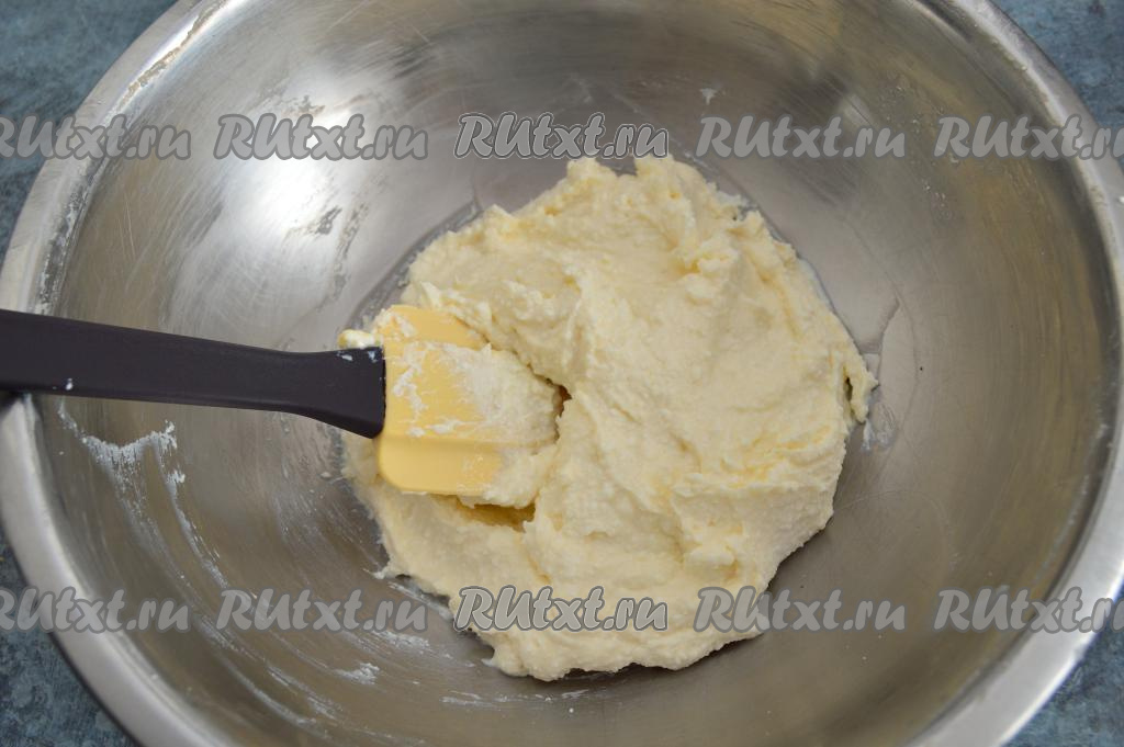 Перемешать творожную массу, тщательно растирая творог с сахаром и яйцом.