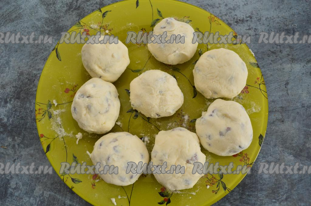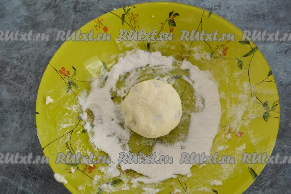 Вмешать изюм в творожную массу и начать по столовой ложке добавлять рисовую муку, каждый раз полностью вмешивая её.