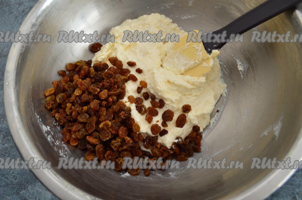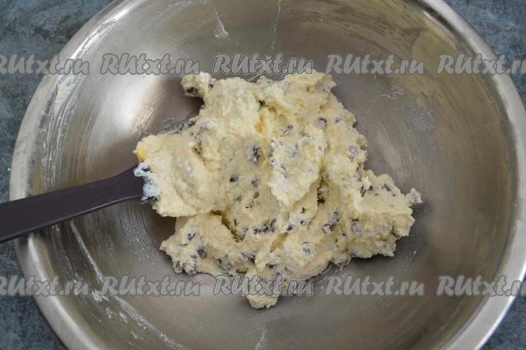 Затем в однородную творожную массу добавить обсохший изюм.