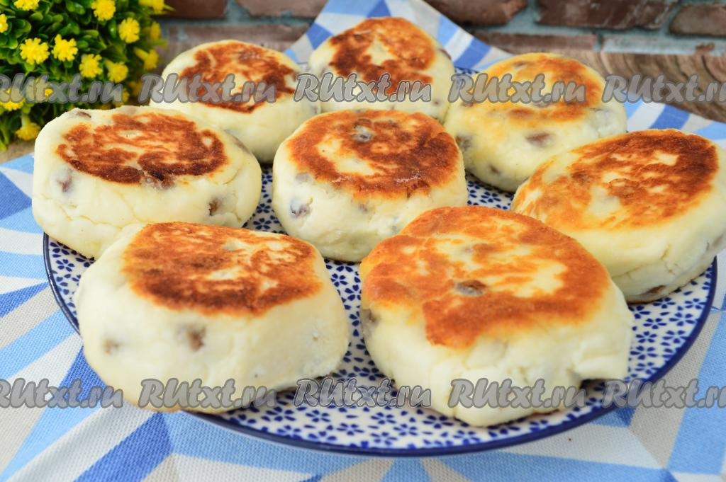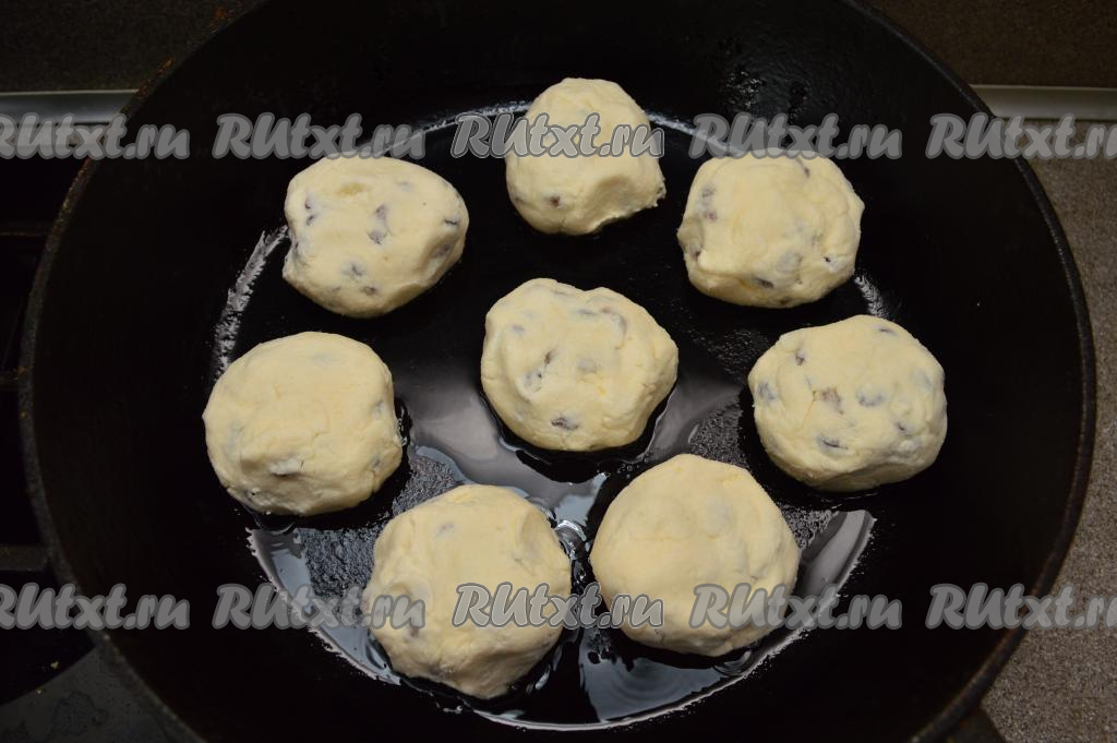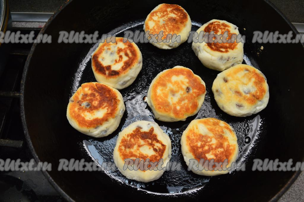 Жарить сырники с изюмом по 2-3 минуты с каждой стороны (до золотистой корочки) на среднем огне. Когда сырники уже поджарились и стали румяными с двух сторон, я обычно выключаю огонь, накрываю сковороду крышкой и даю сырникам потомиться ещё 5 минут, как бы "пропариться".