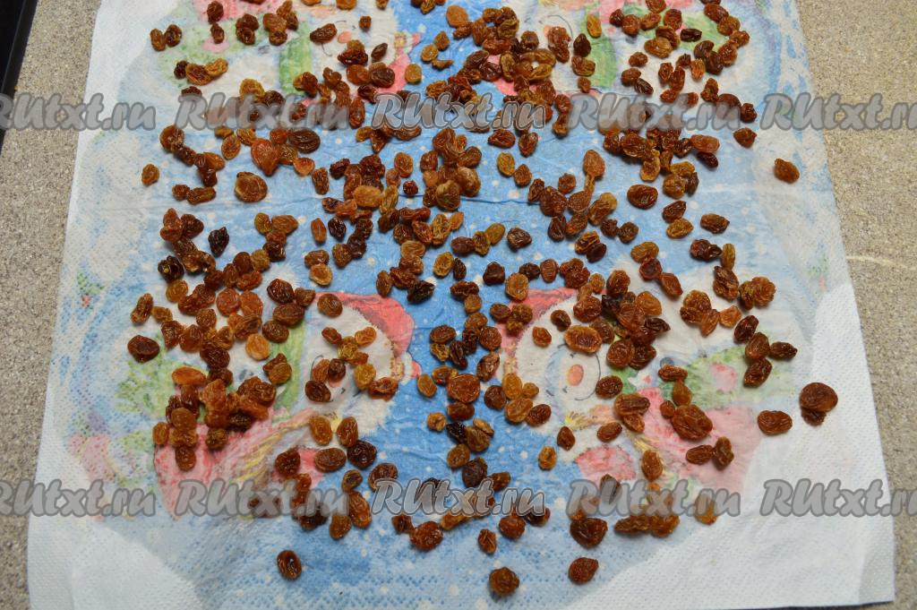 По прошествии 5 минут переложите изюм в сито, тщательно промойте под проточной водой, оставьте на несколько минут, чтобы стекла лишняя вода. А затем разложите изюм на плотной бумажной салфетке (или на бумажном полотенце), чтобы он немного обсох. Осмотрите изюм, если есть мелкие палочки, прикреплённые к изюминкам, удалите их.