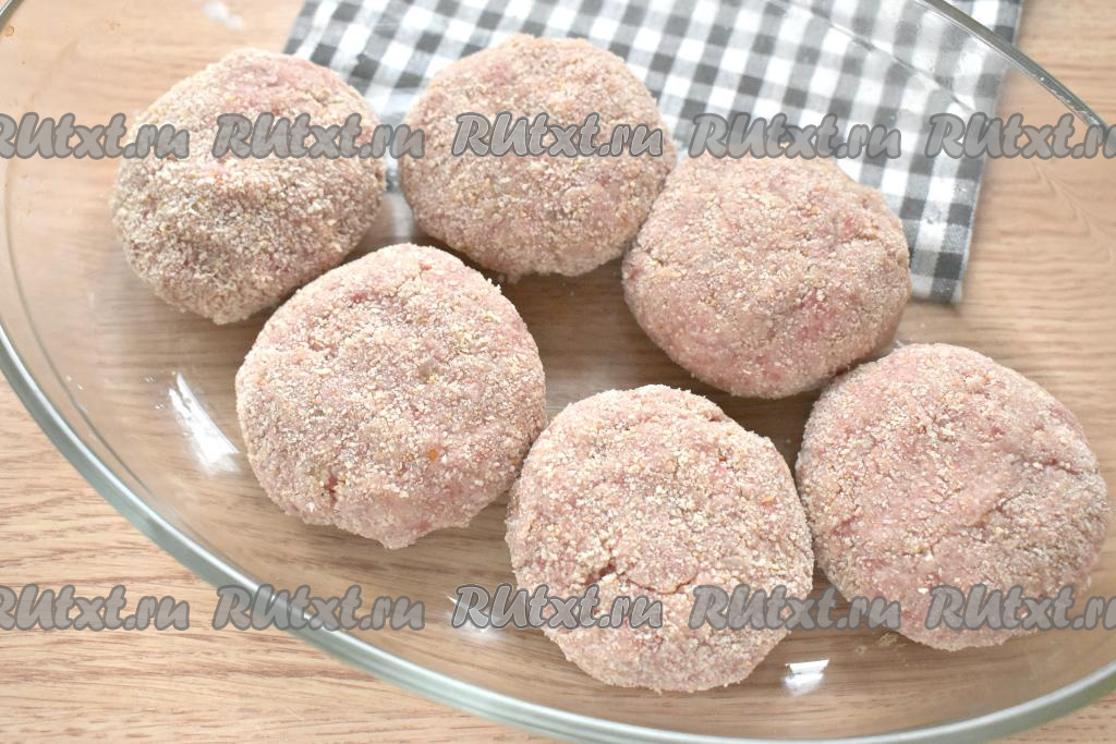 Из фарша формируем круглые котлеты и обваливаем их в панировочных сухарях со всех сторон.