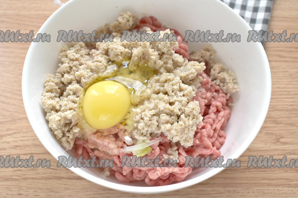 В фарш с луком разбиваем яйцо, добавляем отжатый от молока хлебный мякиш. Само молоко пока не выливайте, оно нам может пригодиться.