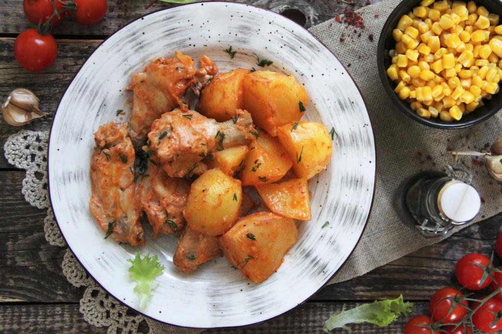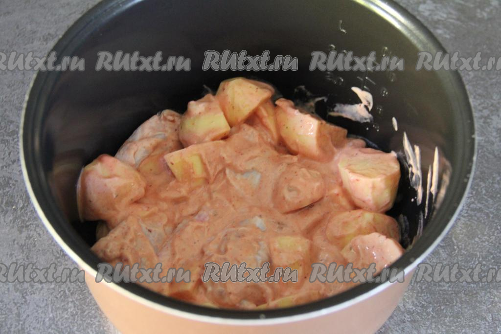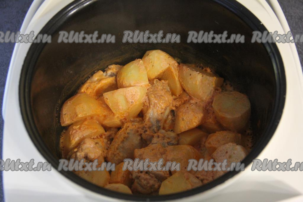 Тщательно перемешать картошку и крылья, покрывая их томатно-сметанным соусом со всех сторон, и оставить при комнатной температуре минут на 30. Затем куриные крылышки и картошку вместе с томатно-сметанным соусом выложить в чашу мультиварки.