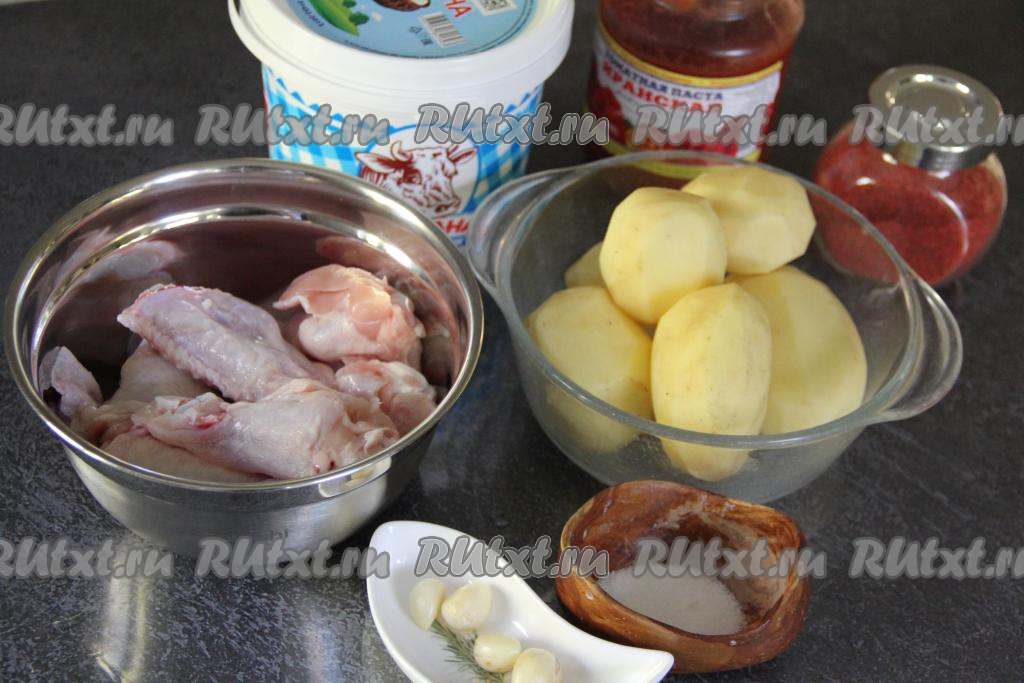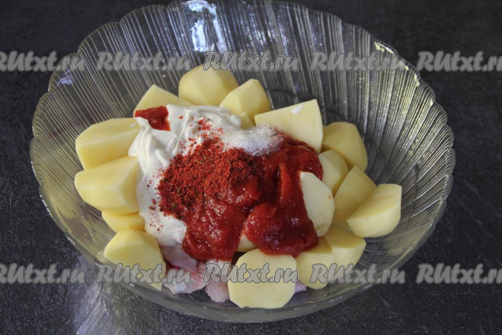 К картошке и куриным крылышкам добавить сметану, томатную пасту, соль, специи и пропущенный через пресс чеснок.