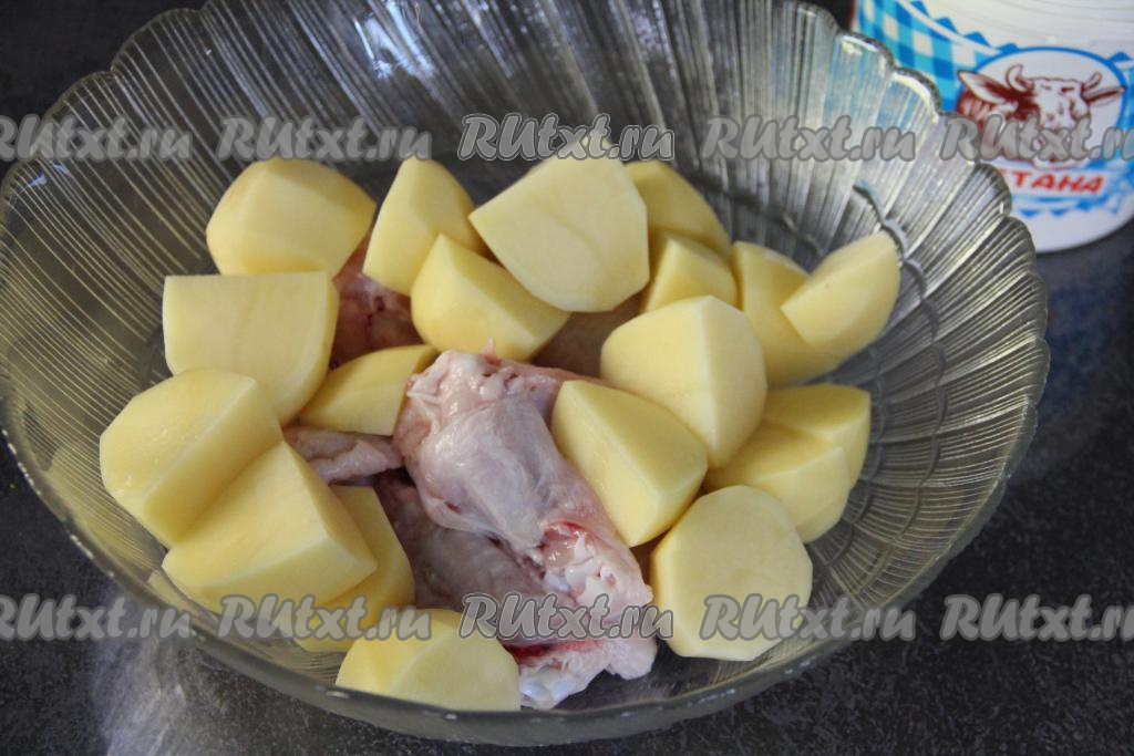 В глубокую миску выложить куриные крылышки и крупно нарезанную картошку.