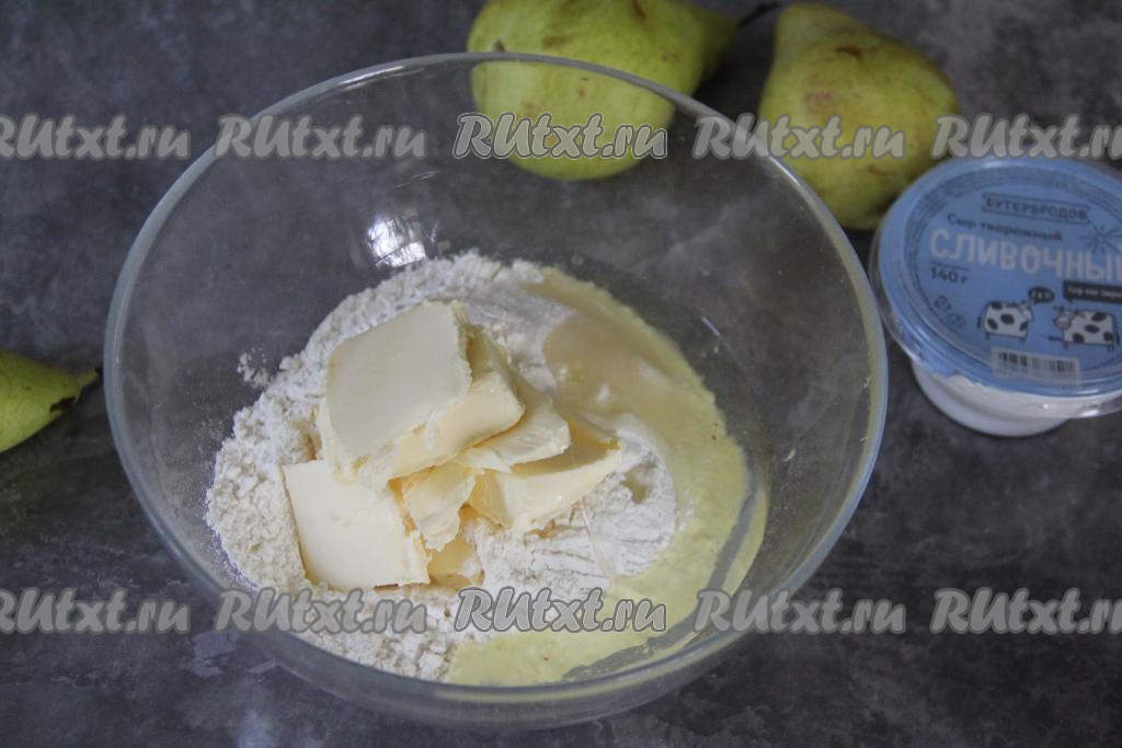Выложить ломтики груши внахлёст на творожную начинку, как на фото.