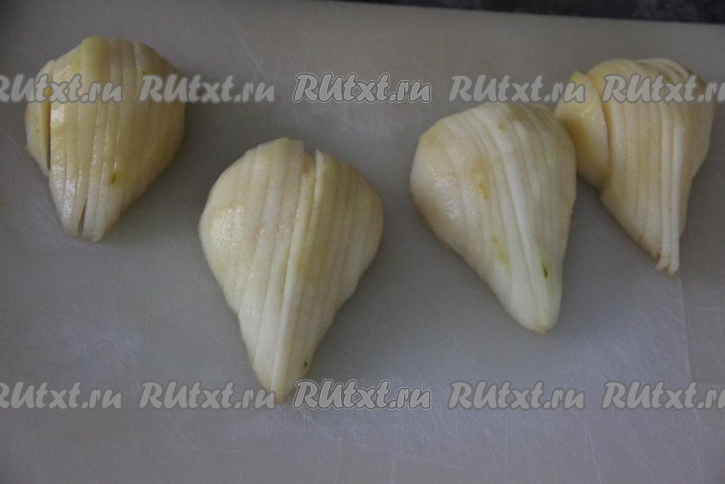 Груши вымыть, очистить от кожуры и семечек. Разрезать груши на две части и нарезать на тонкие ломтики.