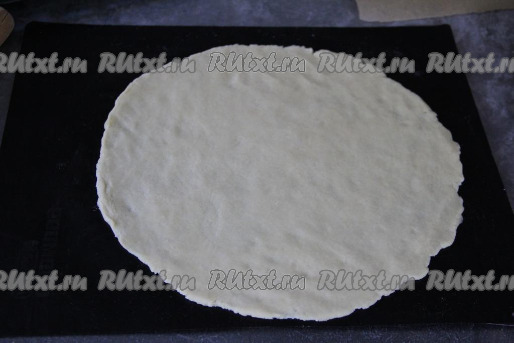 На тефлоновом коврике (или на пергаменте), на котором будете выпекать галету, раскатать тесто в круг диаметром примерно 30 сантиметров.