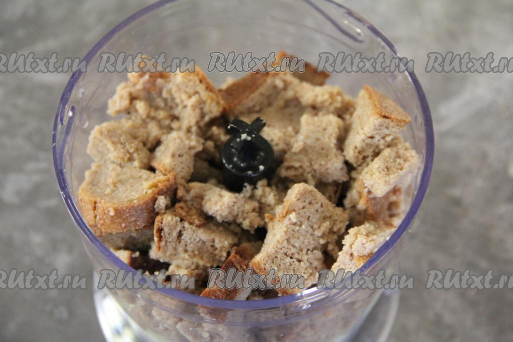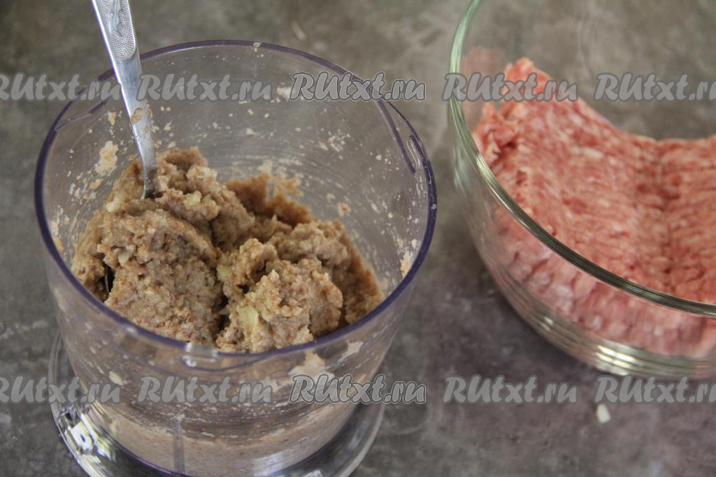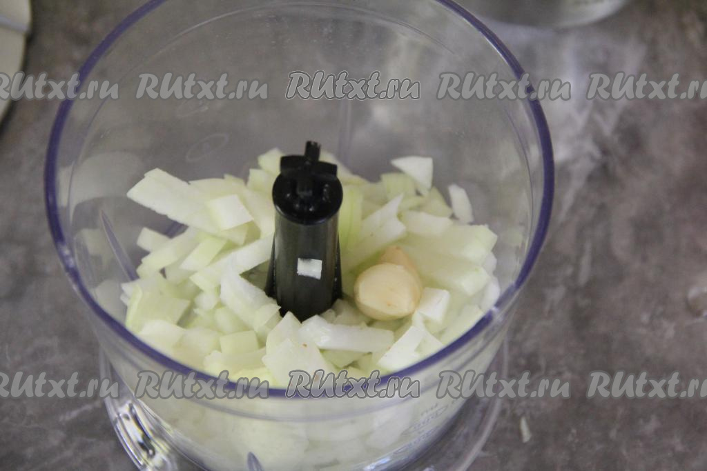 Измельчить хлеб с луком и чесноком до однородности. Если нет измельчителя, можно лук с чесноком и хлебом, отжатым от лишней жидкости, пропустить через мясорубку.