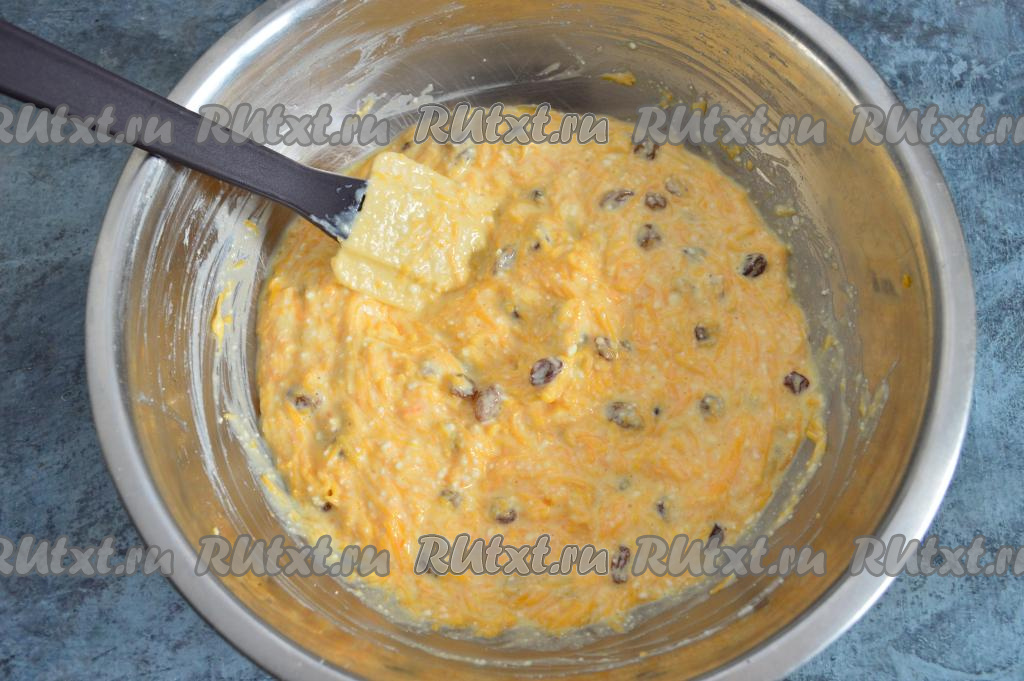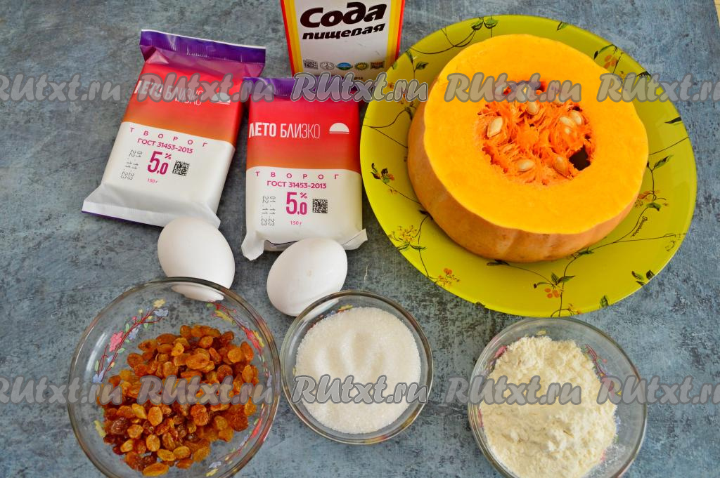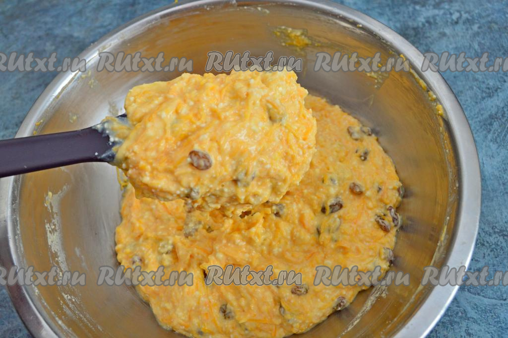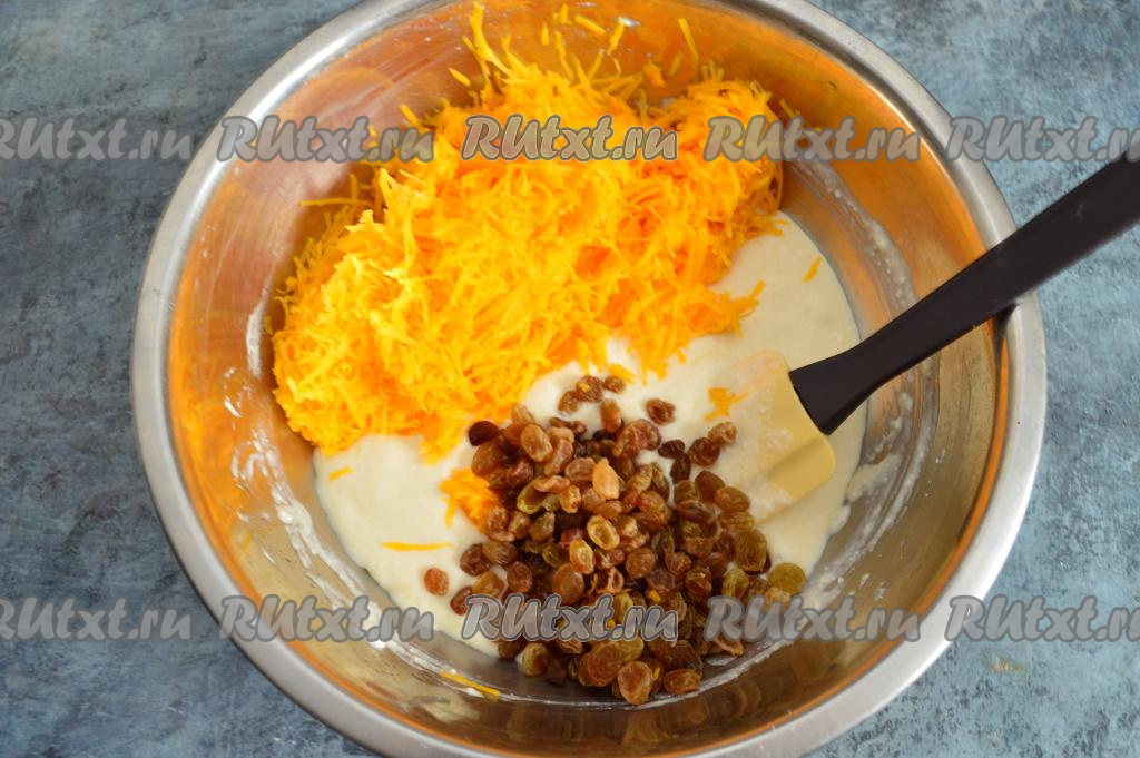 Тыкву очистить от кожуры, семечек и волокнистой части. Для приготовления запеканки нам потребуется 250 грамм очищенной тыквы. Натереть мякоть тыквы на мелкой тёрке. Выложить натёртую тыкву и обсохший изюм в миску с творожно-яичной массой.