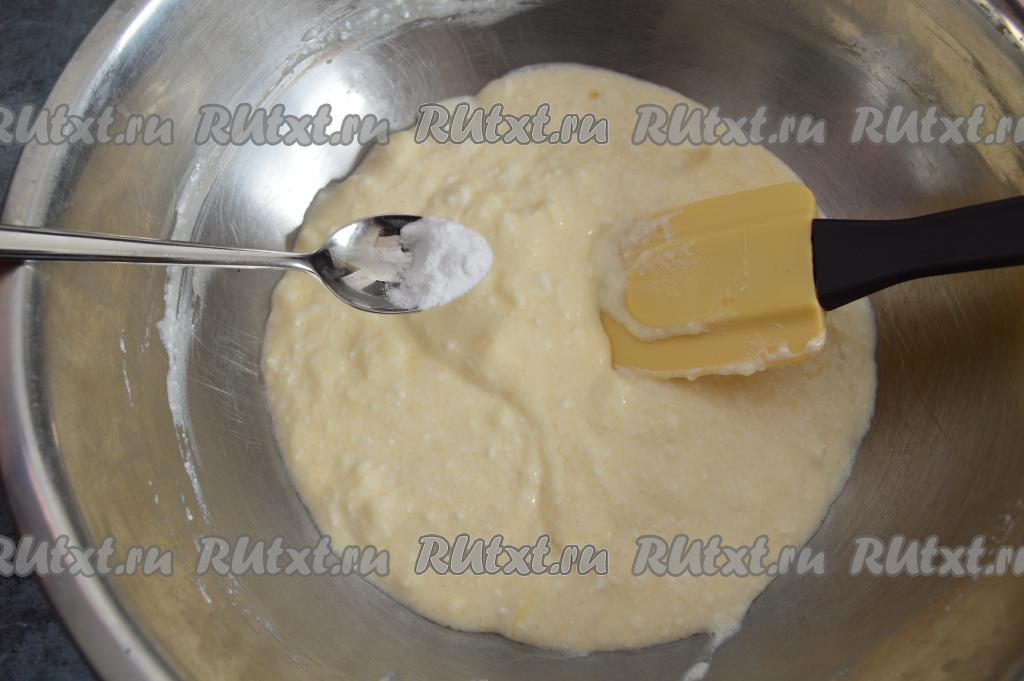 Перемешать творожно-яичную массу до однородности. Всыпать 1/3 чайной ложки соды (или 1 чайную ложку разрыхлителя) и ещё раз перемешать творожно-яичную массу.