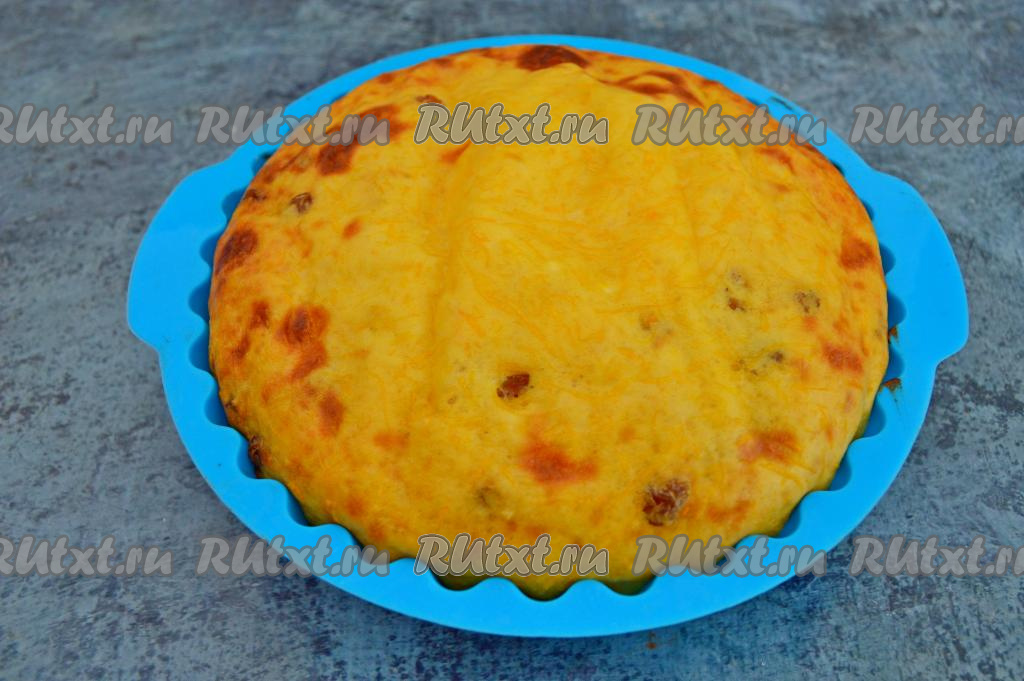 Поставить форму с тестом в разогретую духовку. Выпекать творожную запеканку с тыквой и изюмом минут 45-50 при температуре 180 градусов. Готовая запеканка хорошо подрумянится и увеличится в объёме. Готовность можно проверить, проколов выпечку сухой деревянной лучиной (если запеканка уже готова, значит лучина после прокалывания выпечки останется чистой и сухой).