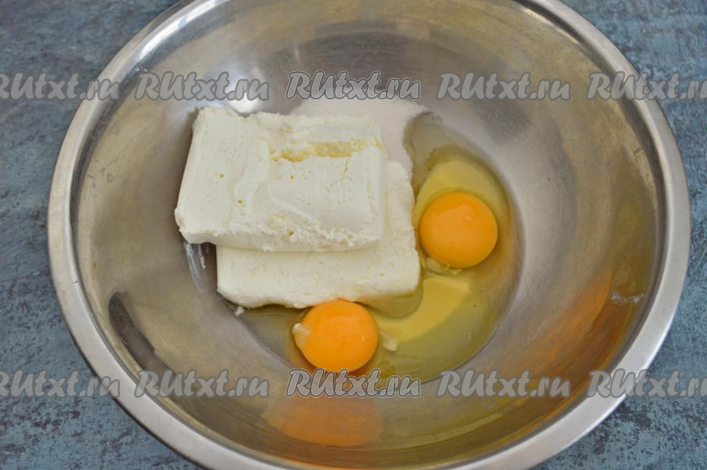 Пока изюм замачивается, можно заняться тестом для творожной запеканки. Для этого в глубокой миске нужно соединить сахар, яйца и творог.