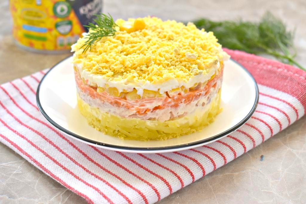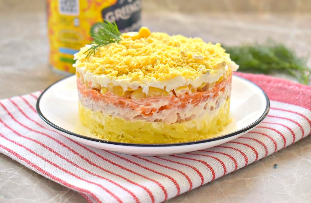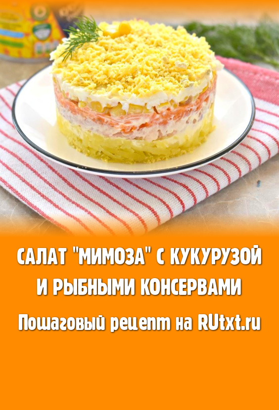 "Мимоза" является одним из самых популярных салатов на праздничном столе. Вариантов этого блюда очень много. Предлагаю вам приготовить этот салат с консервированной кукурузой и рыбными консервами. В составе такой "Мимозы" отлично сочетаются все ингредиенты. Присутствие кукурузы в блюде делает этот салат особенно аппетитным и сочным. Слоёный салат "Мимоза" с кукурузой и консервами - это отличный выбор для тех, кто ценит простоту и вкус в одном блюде.