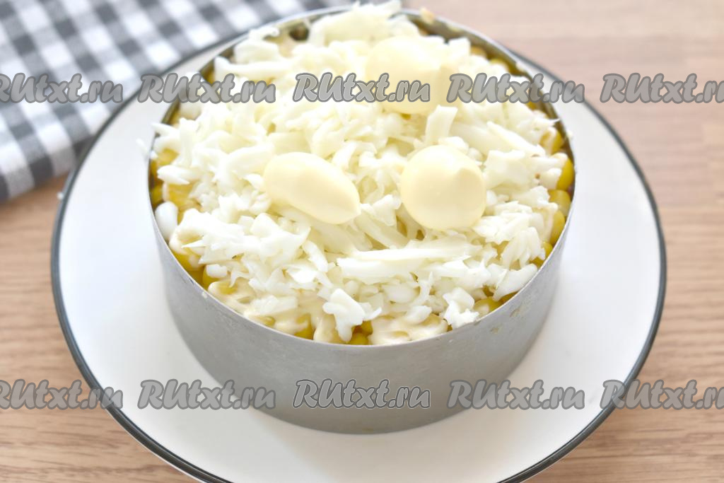 Куриные яйца разделяем на белки и желтки. Сейчас нам потребуются только белки. Натираем их на крупной тёрке, выкладываем поверх кукурузы, немного солим и смазываем майонезом.