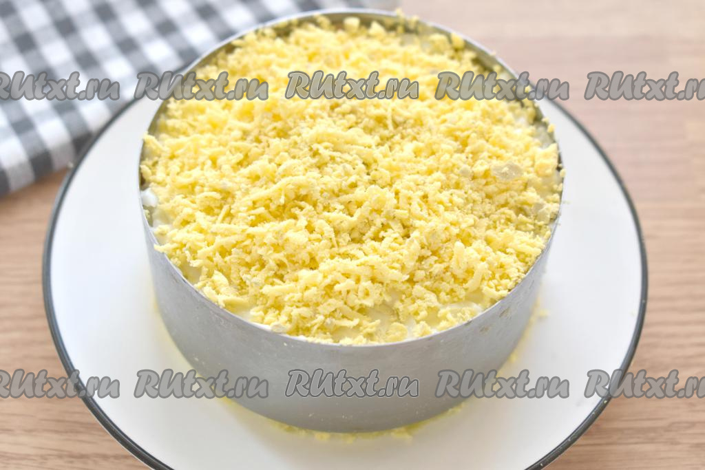 По традиции завершающим слоем выкладываем натёртые на мелкой тёрке желтки.