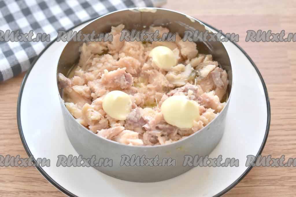 Рыбные консервы из банки сначала перекладываем на тарелку, убираем крупные косточки, если они есть, разминаем рыбу вилкой, а затем уже равномерно раскладываем поверх картошки. Слой из рыбных консервов тоже смазываем майонезом.