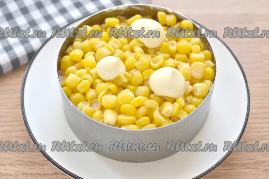 Консервированную кукурузу выкладываем вначале на сито, чтобы стекла лишняя жидкость. А затем раскладываем кукурузу равномерно поверх моркови, смазываем майонезом.
