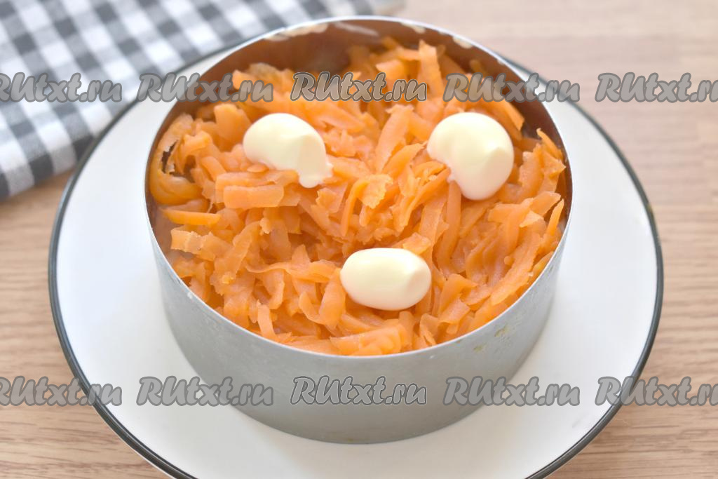 Очищенную варёную морковь натираем на крупной тёрке, выкладываем поверх рыбы, смазываем майонезом.