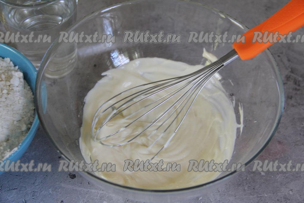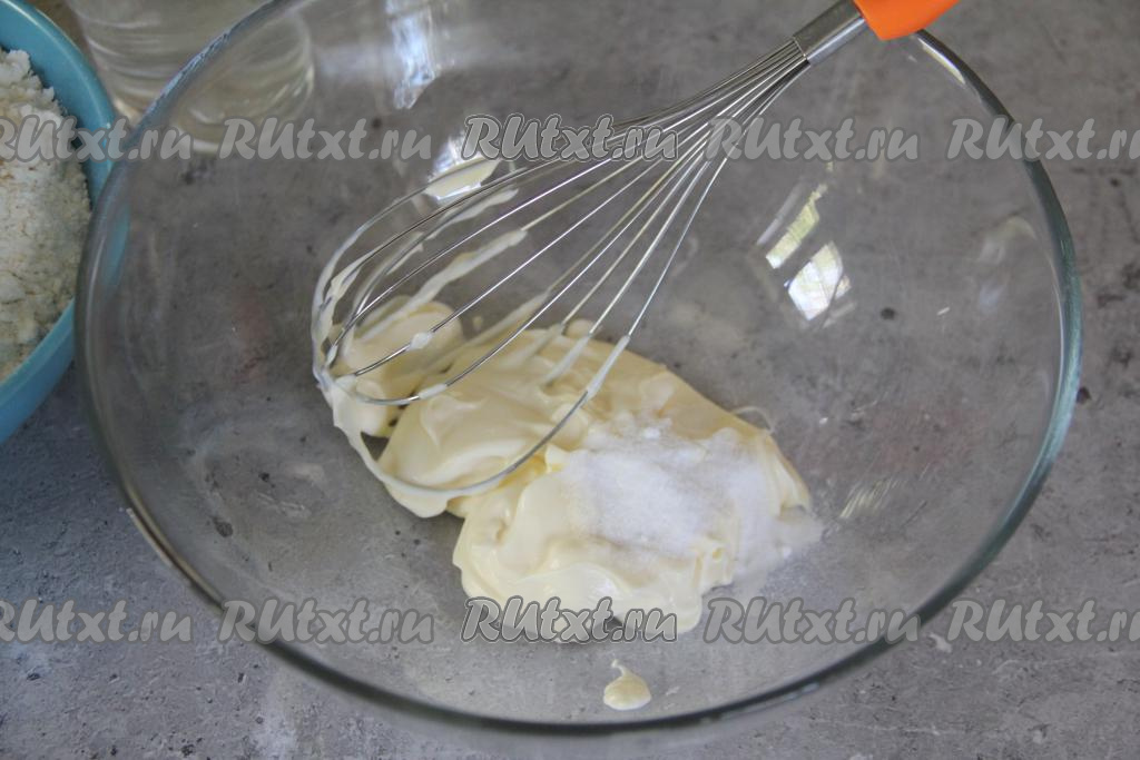 Перемешать массу венчиком, таким образом сода погасится в майонезе.