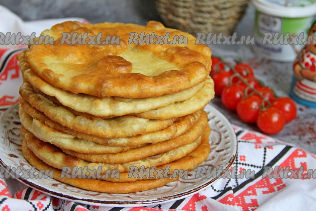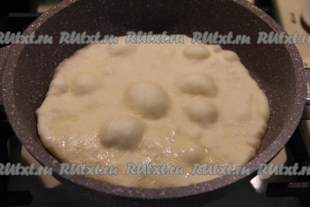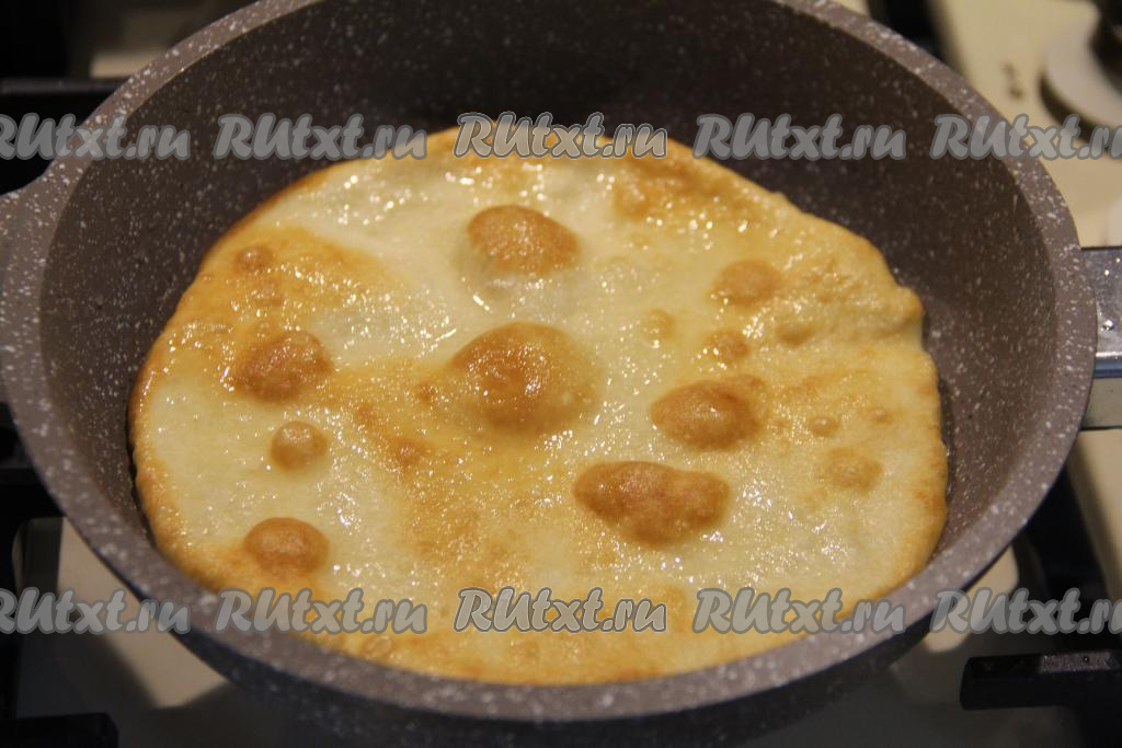 В сковороду (диаметр сковородки должен быть не менее 18 сантиметров, то есть диаметр сковороды должен быть больше диаметра лепёшки) влить растительное масло, прогреть его очень хорошо. Выложить лепёшку в сковороду, огонь уменьшить до среднего. Когда на поверхности теста надуются пузыри, перевернуть лепёшку на другую сторону.