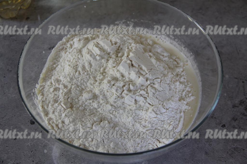 Всыпать частями муку, каждый раз хорошо вмешивая её в тесто.