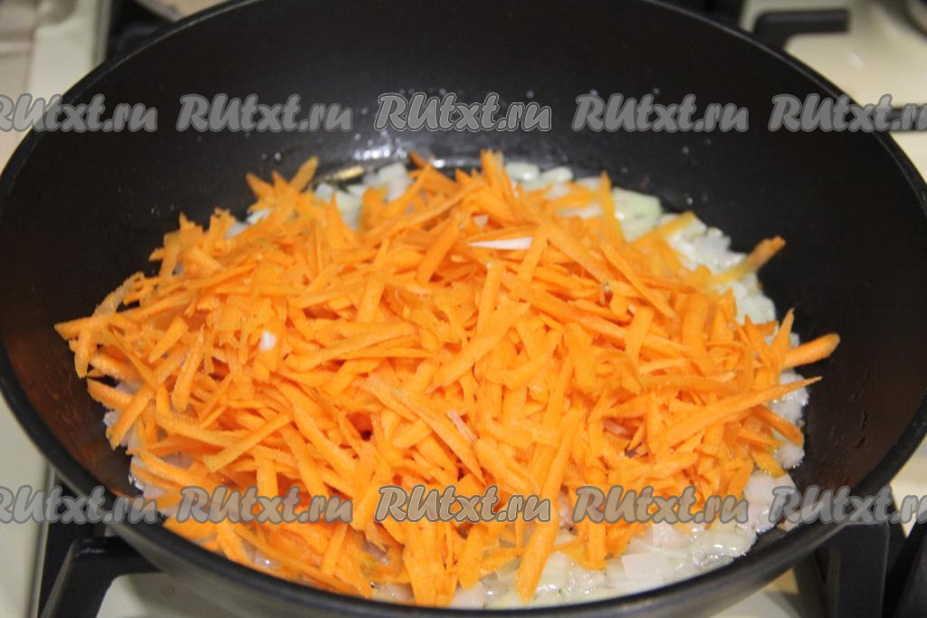 Обжарить лук в течение 3-4 минут (до прозрачности). Морковь, натёртую на крупной тёрке, выложить к обжаренному луку, перемешать. Обжаривать овощи 4-5 минут (морковка должна стать достаточно мягкой), иногда помешивая.