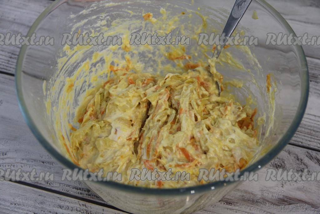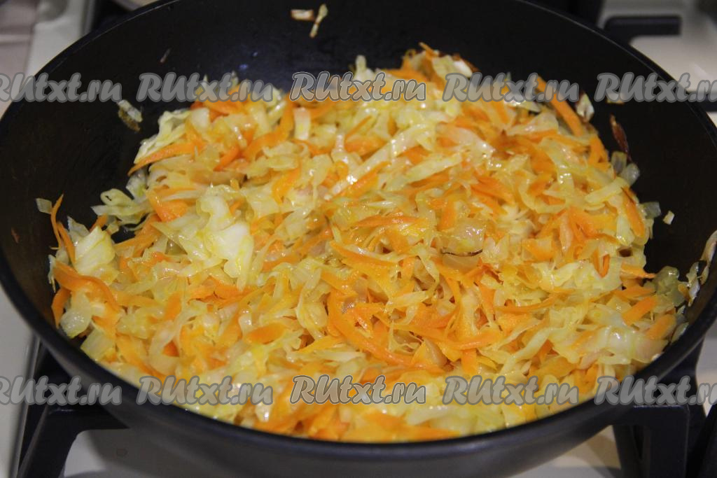 Обжаривать овощи, периодически помешивая, минут 15-20 (до мягкости капусты). За несколько минут до окончания жарки посолить по вкусу, тщательно перемешать. Когда капуста станет мягкой, снять начинку для ленивых пирожков с огня и слегка остудить.