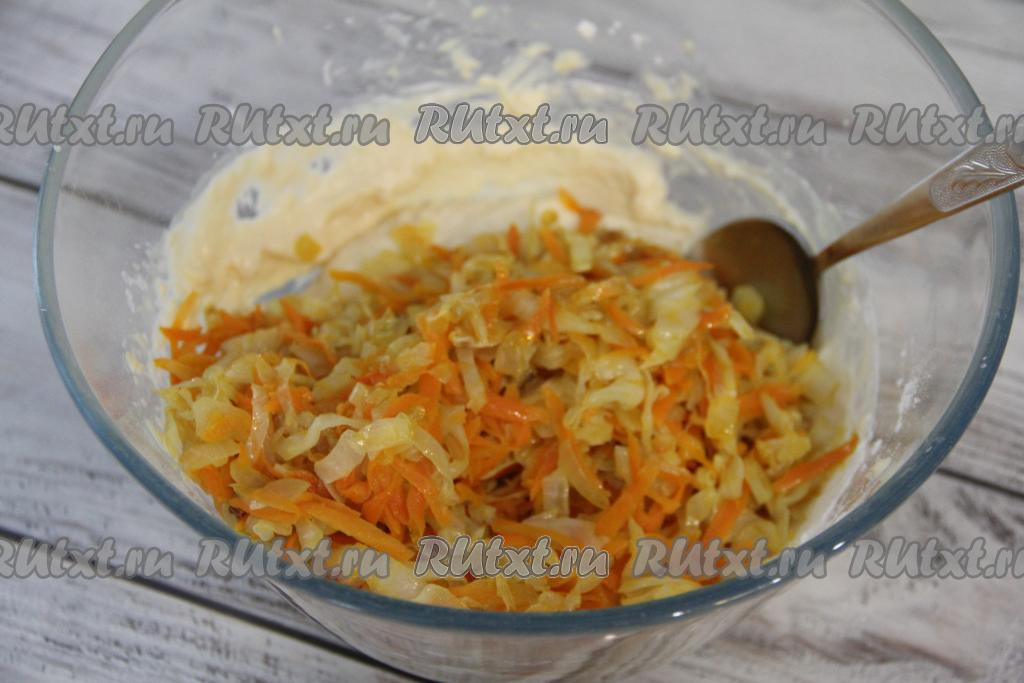 В миску с получившимся тестом добавить остывшую капустную начинку.