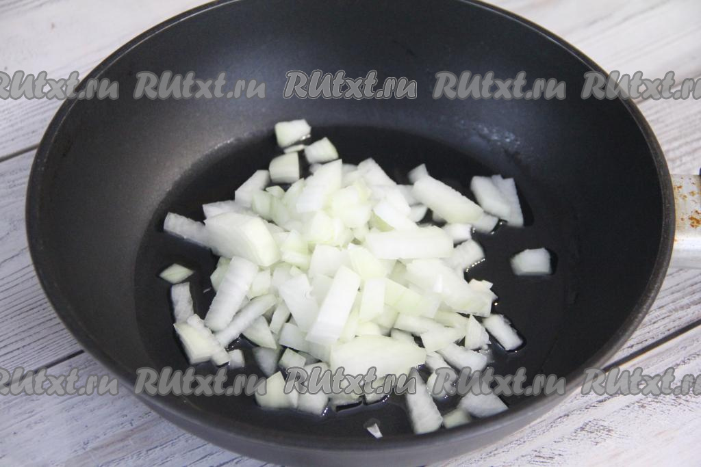 Прежде всего приготовим начинку для наших пирожков, для этого нужно влить в сковороду растительное масло, хорошо разогреть его и, уменьшив огонь до среднего, выложить мелко нарезанную луковицу.
