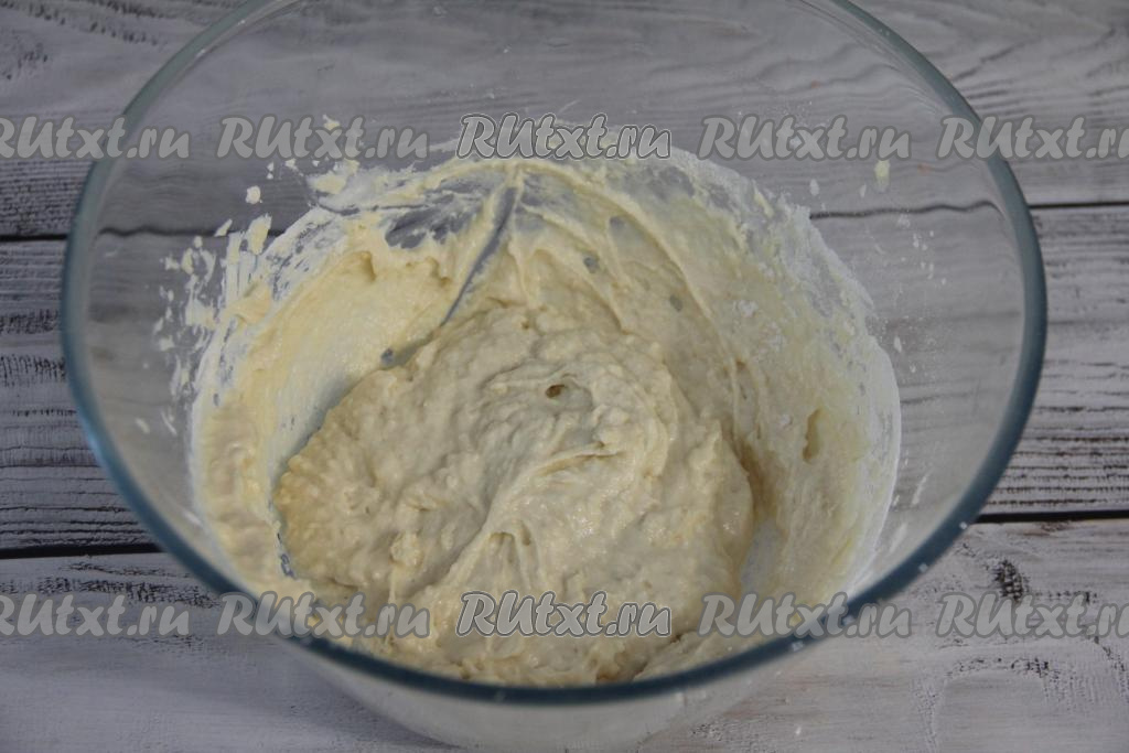 Перемешать тесто для ленивых пирожков венчиком, оно получится вязким, напоминающим тесто для оладий.