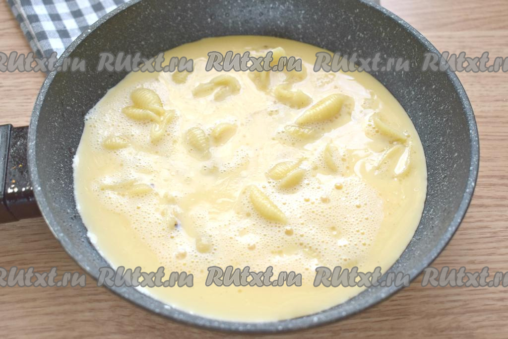 Смесь из молока и яиц выливаем к макаронам на сковороду.