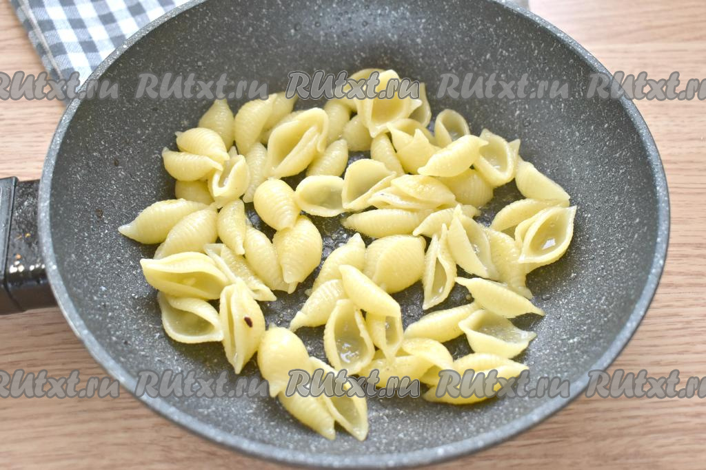 Когда макароны будут готовы, откидываем их на дуршлаг, чтобы вся вода полностью слилась. Разогреваем на сковороде растительное масло, выкладываем отваренные макароны и обжариваем их в течение 1-2 минут, периодически аккуратно перемешивая.