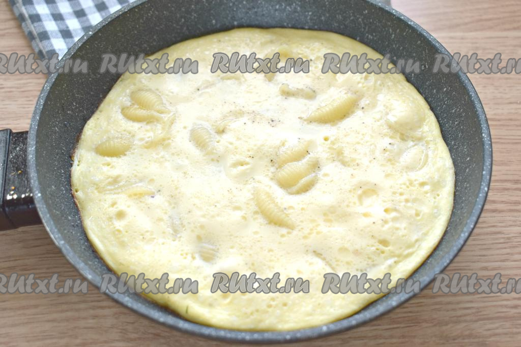 Сковороду накрываем крышкой и готовим омлет с макаронами на умеренном огне 4-5 минут. Яично-молочная масса должна полностью схватиться.