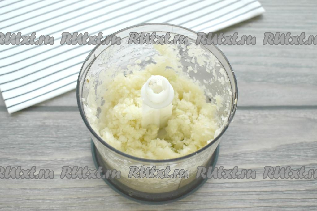 Капусту и лук нарезаем на куски, перекладываем в чашу измельчителя, добавляем зубчик чеснока, прокручиваем, получается сочная масса из капусты и лука, как на фото. Если такого измельчителя нет, тогда можно капусту с луком и чесноком пропустить через мясорубку (или натереть на тёрке).