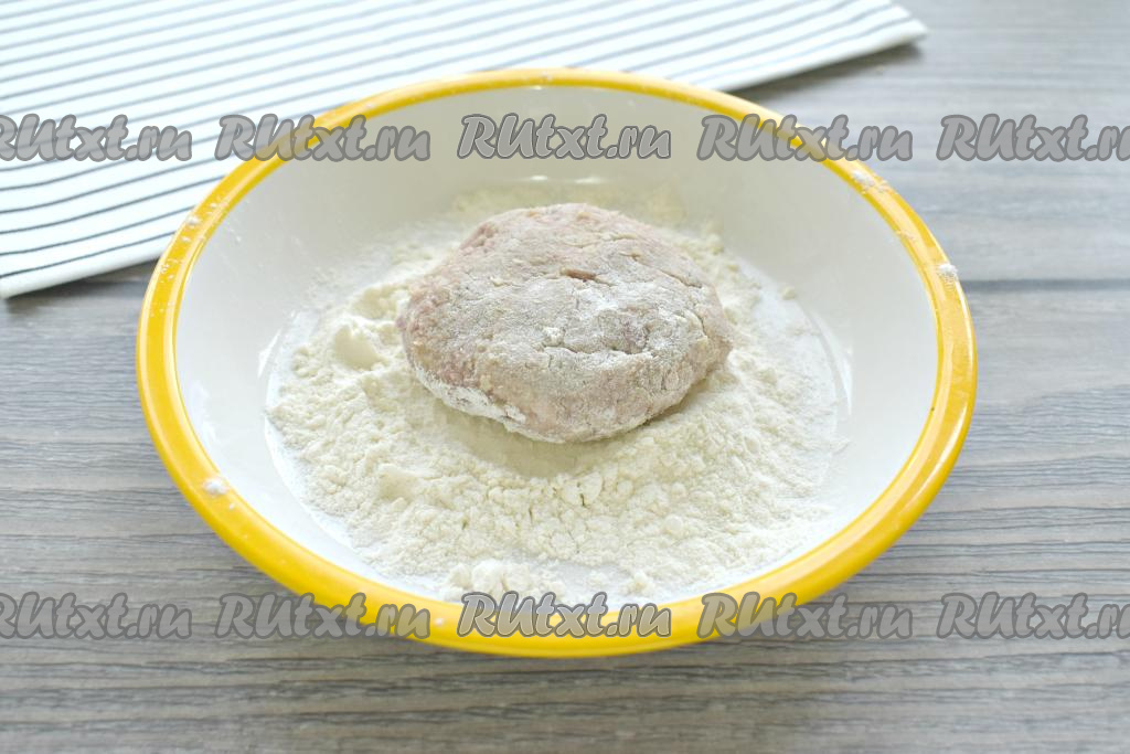 В небольшую тарелку насыпаем муку. Заготовки для котлет немного прижимаем, обваливаем со всех сторон в муке.