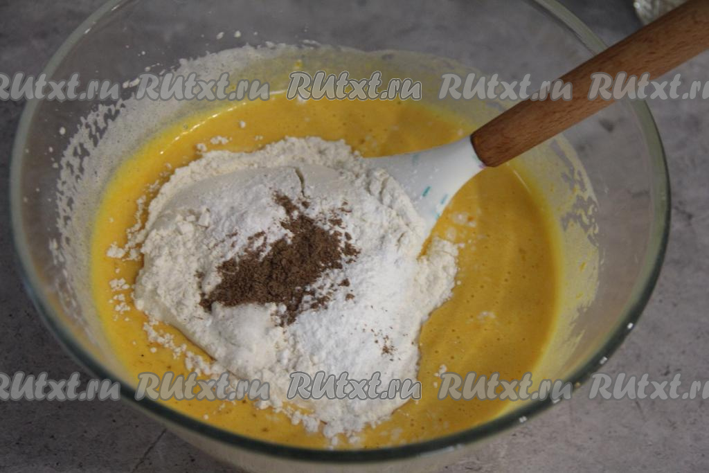 Затем всыпать половину просеянной муки, ванилин, соль, разрыхлитель и корицу, перемешать тыквенное тесто для кекса лопаткой.