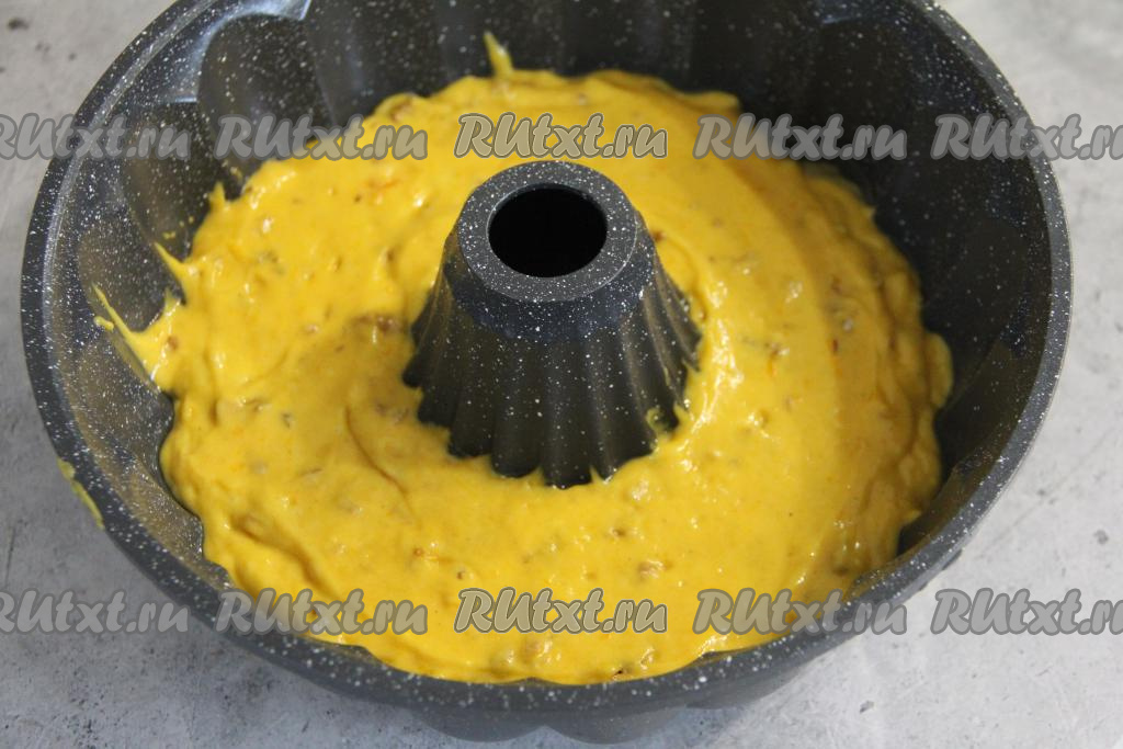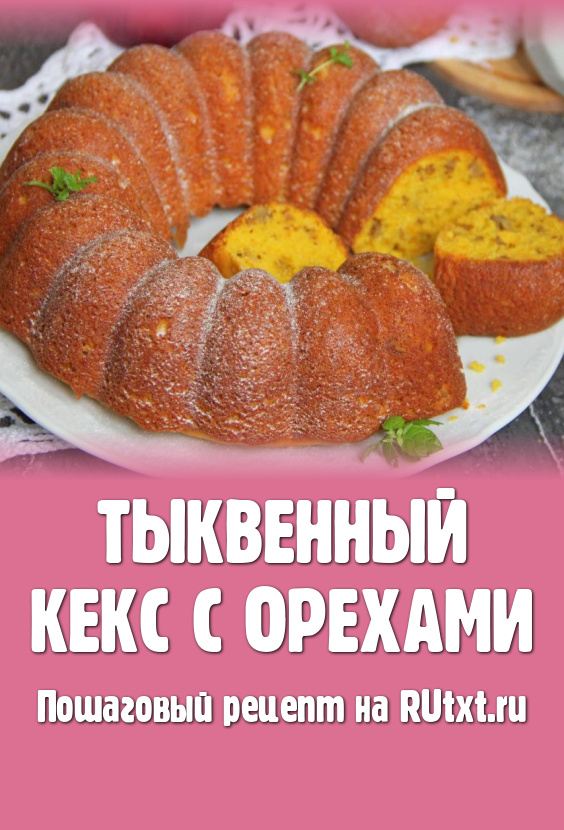 Выпекать кекс с тыквой и грецкими орехами в разогретой духовке минут 40 при температуре 180 градусов.