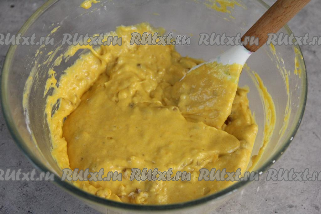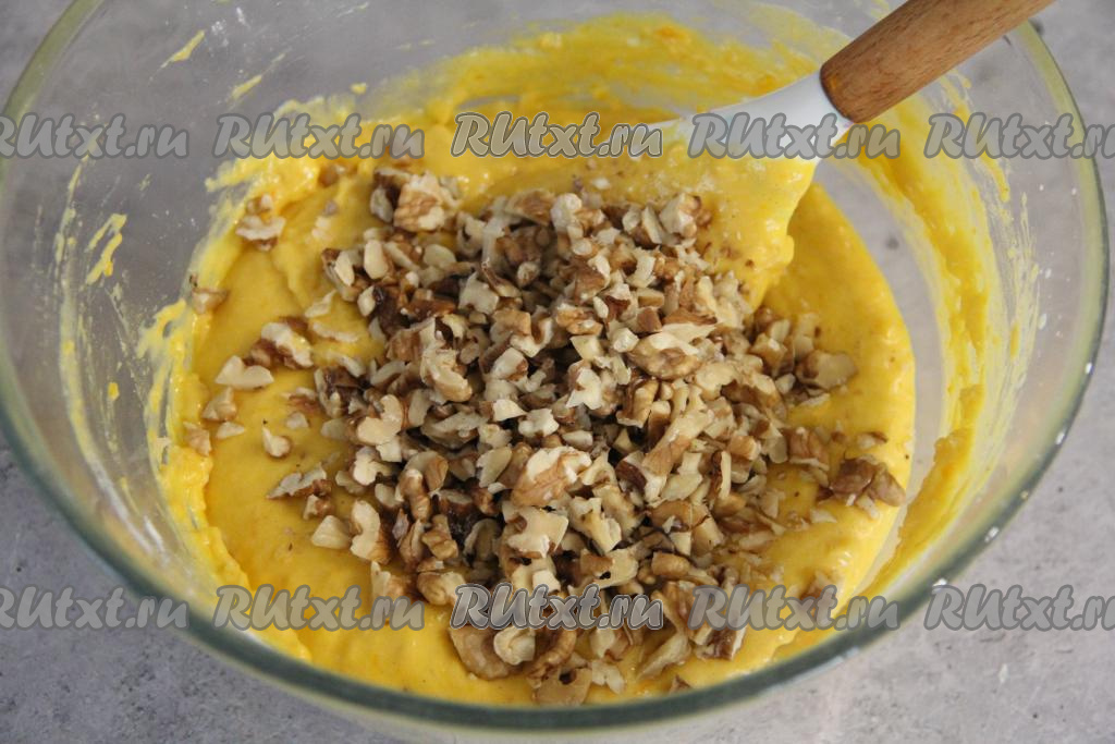 Вмешать орехи лопаткой в тыквенное тесто.