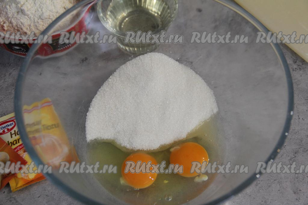 В объёмной миске, удобной для взбивания, соединить яйца и сахар.