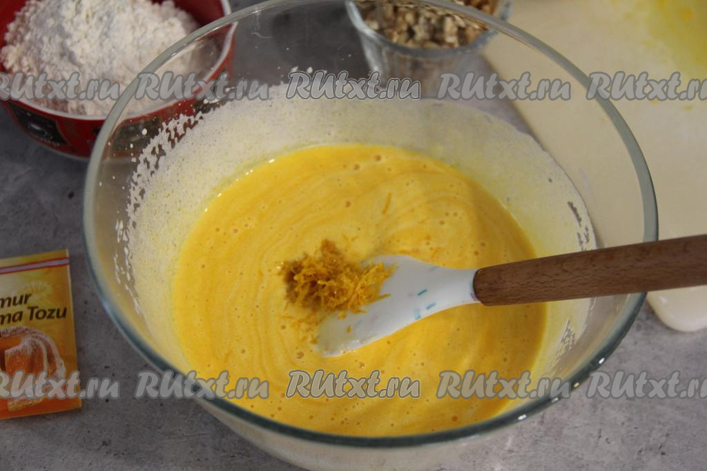 По желанию, можно добавить цедру апельсина. Для этого апельсин нужно хорошо вымыть, снять с него примерно 1 чайную ложку цедры. Добавить цедру в тыквенно-яичную массу и перемешать лопаткой.