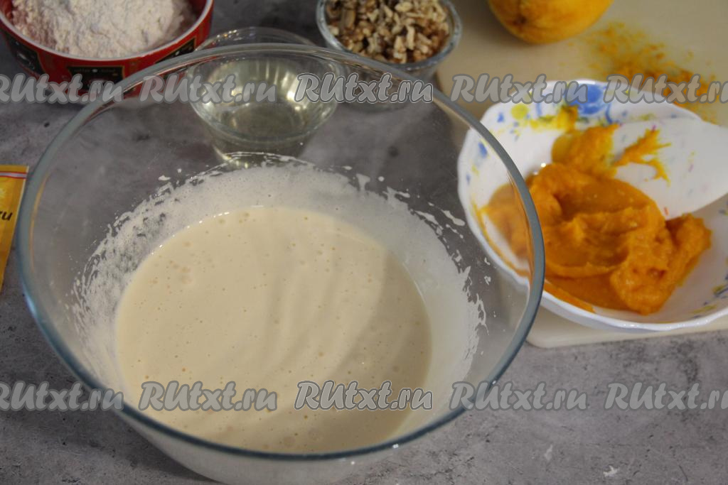 Взбить миксером яйца с сахаром в течение 5 минут, масса посветлеет и станет пышной. Пробить запечённую тыкву в пюре с помощью погружного блендера.