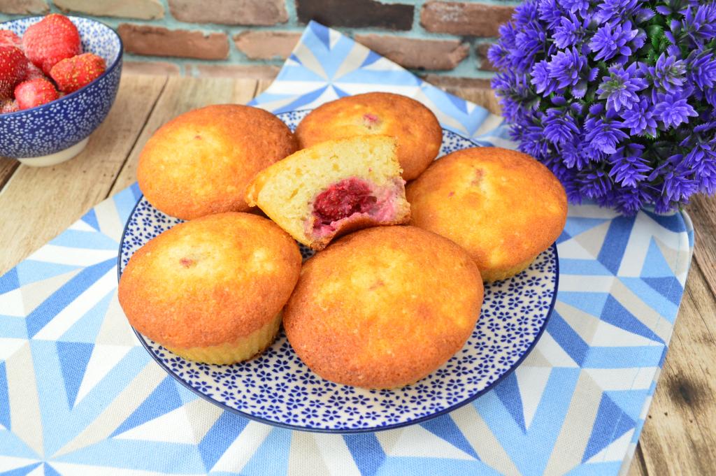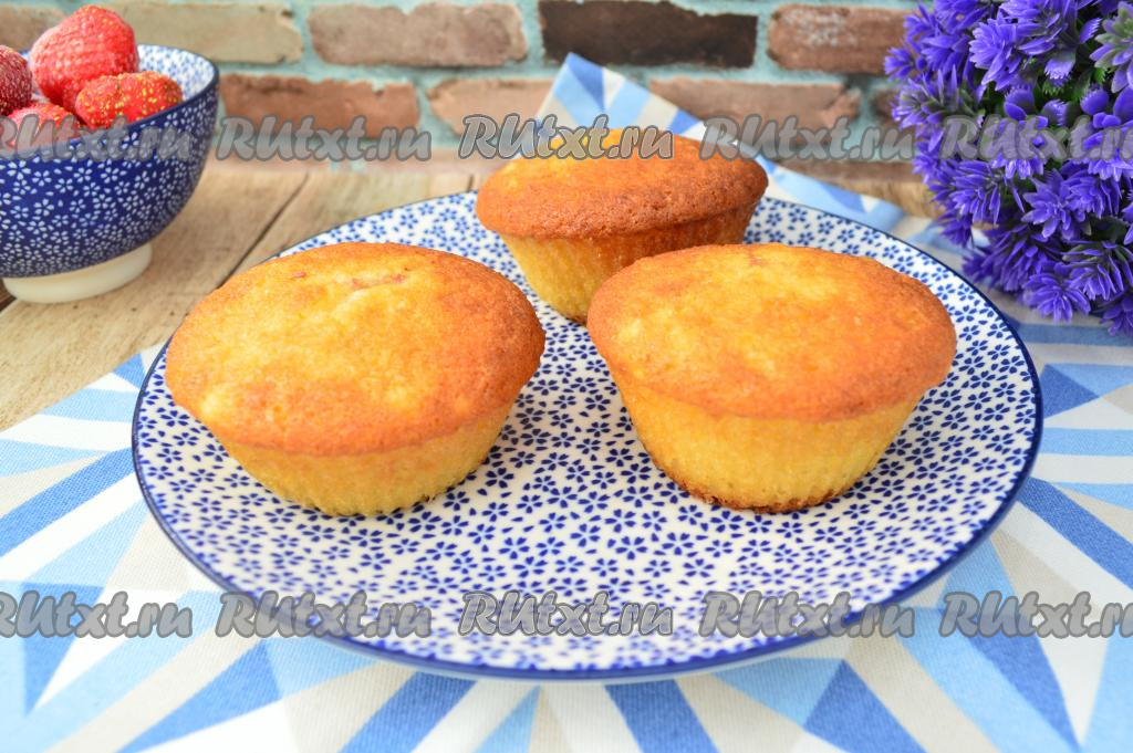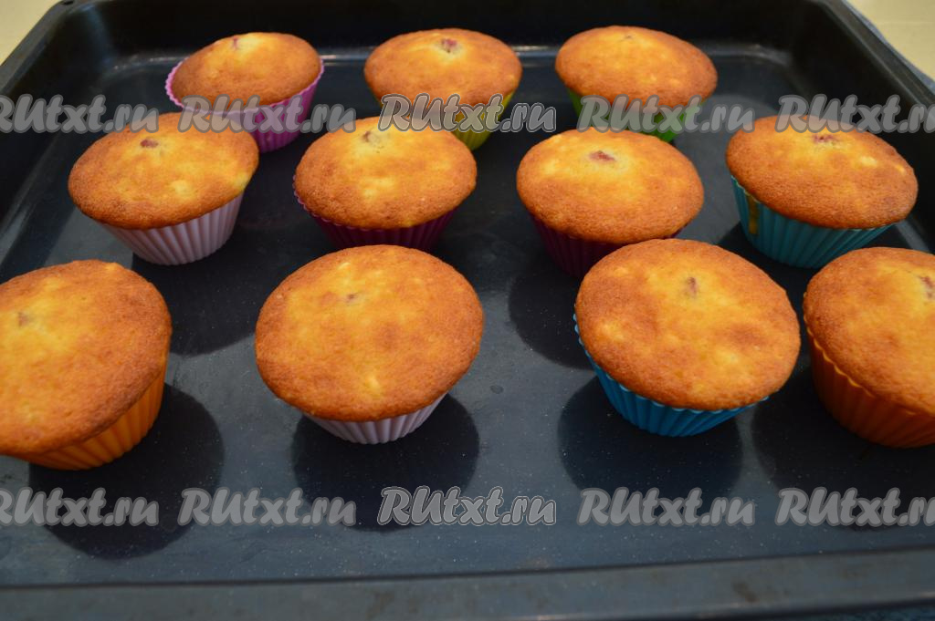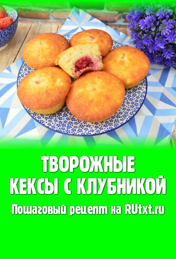 Поставить противень с формочками в хорошо прогревшуюся духовку. Выпекать творожные кексы с клубникой минут 25 при температуре 180 градусов. Для того чтобы убедиться в готовности, просто проколите тесто сухой зубочисткой, если зубочистка останется чистой, следов теста на ней не будет, значит кексики готовы. Кексы хорошо подрумянятся в процессе выпечки.