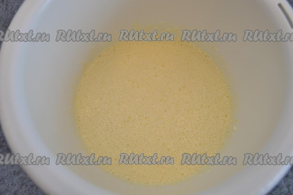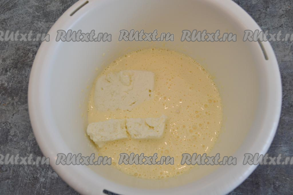 Взбить миксером яйца с сахаром на максимальной скорости в течение 4-5 минут (до побеления массы и увеличения в объёме). Затем добавить творог.