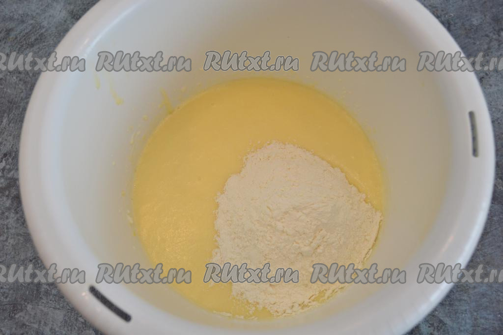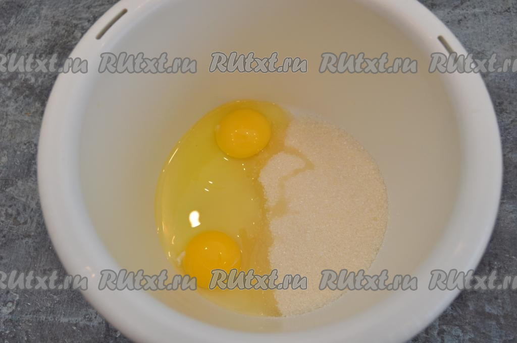 Сливочное масло растопить (я растопила в микроволновке) и оставить остывать при комнатной температуре. В чашу для взбивания вбить сырые яйца, всыпать сахар.