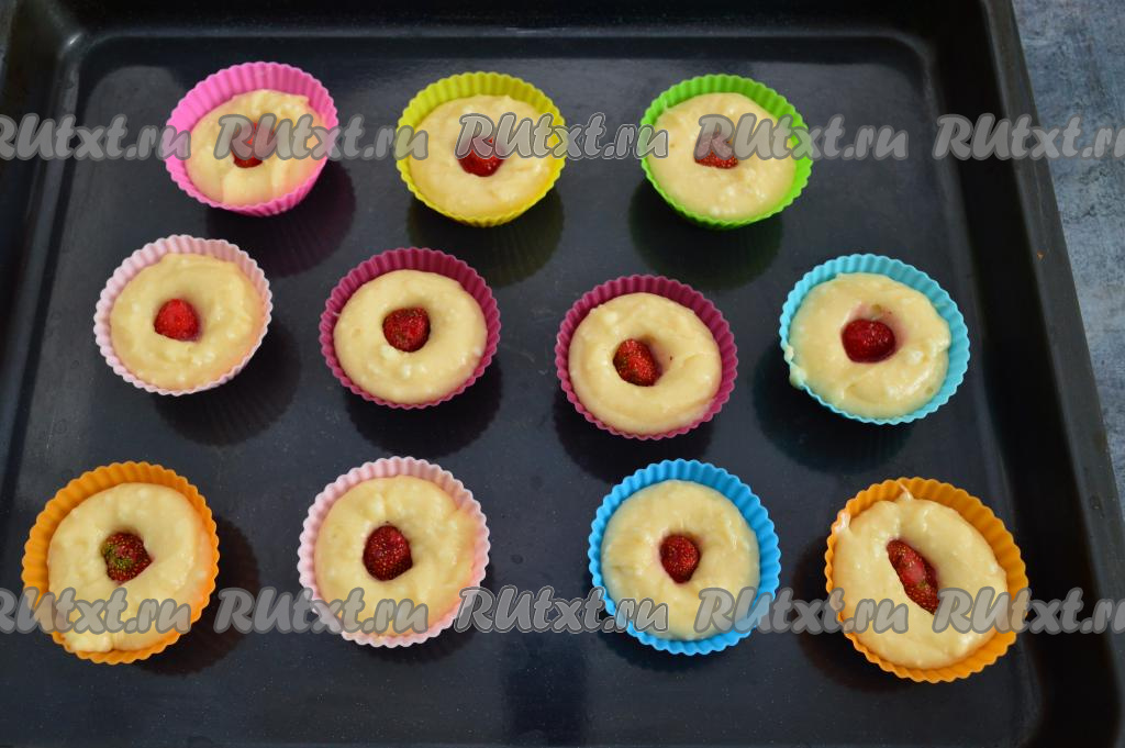 В середину каждого кекса вставить и немного утопить 1 клубнику среднего размера.
