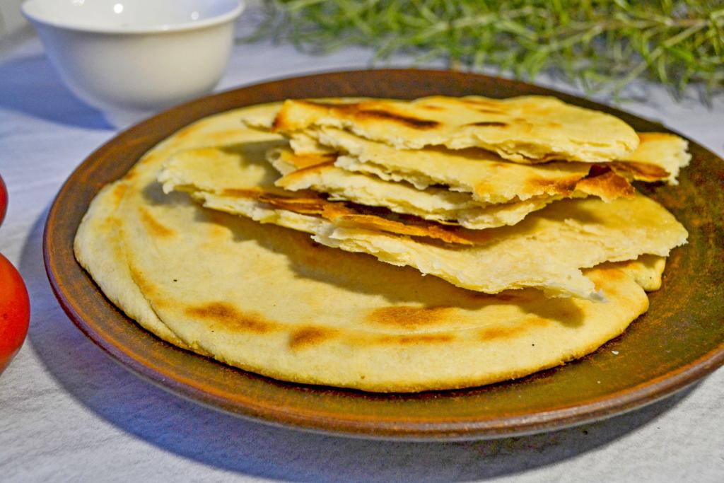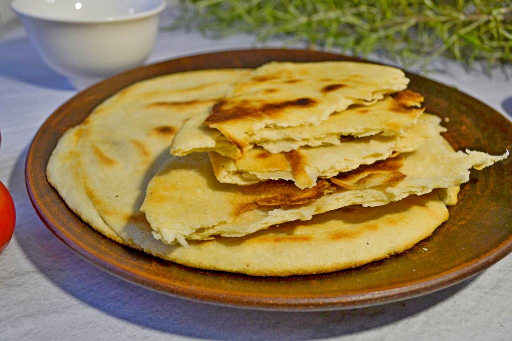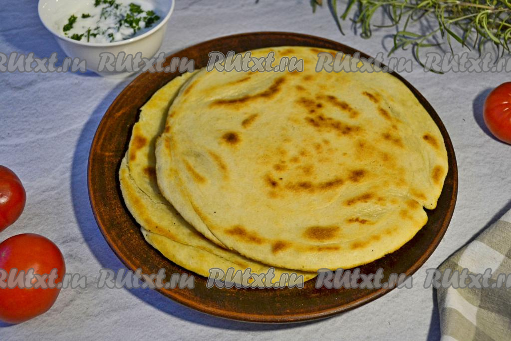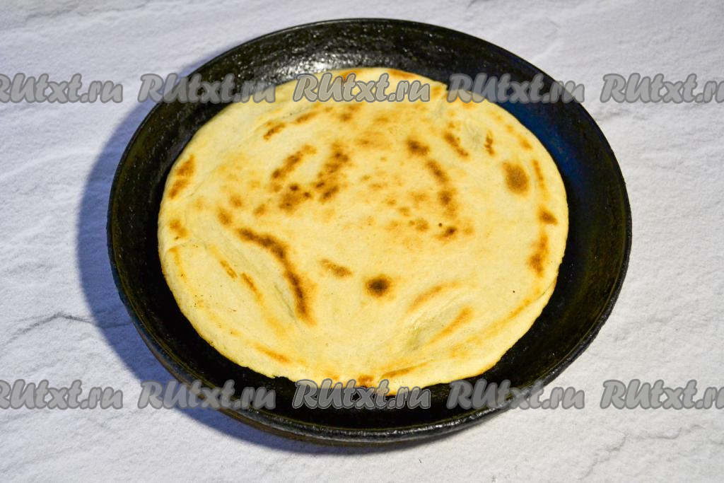 Затем переверните лепёшку и также обжаривайте вторую сторону (до золотистости). Готовую лепёшку переложите на тарелку. Аналогично пожарьте вторую лепёшку.